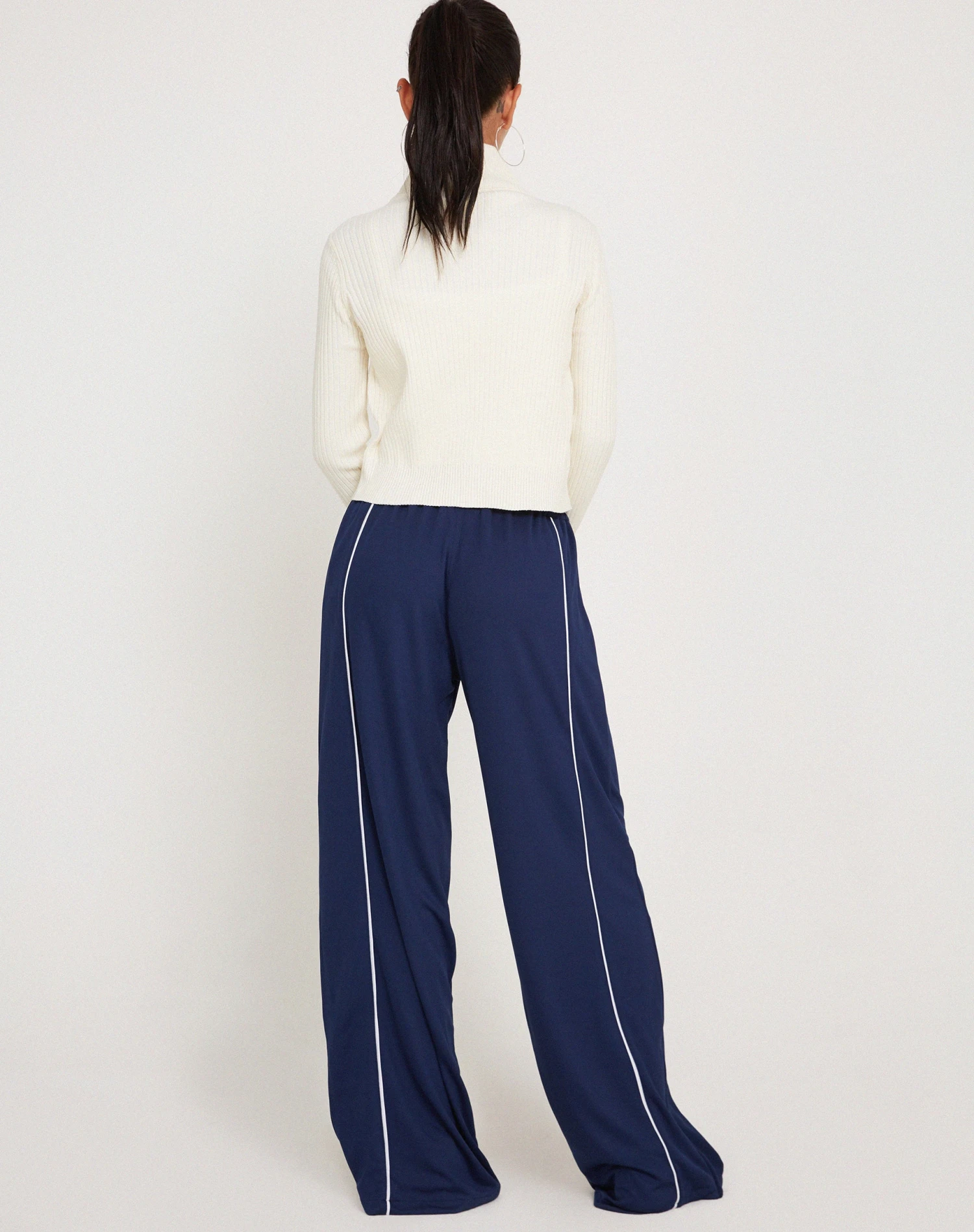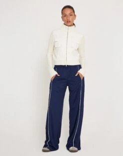 Keep it casual with our Shobi jogger. In a navy dri-fit fabric with white piping and M embroidery detailing, they feature an oversized, loose fit with wide legs and a high elasticated waistband. Finished with zips to outer side seams for a comfy ‘fit. Complete the ‘fit with our Hansol cardi.Â