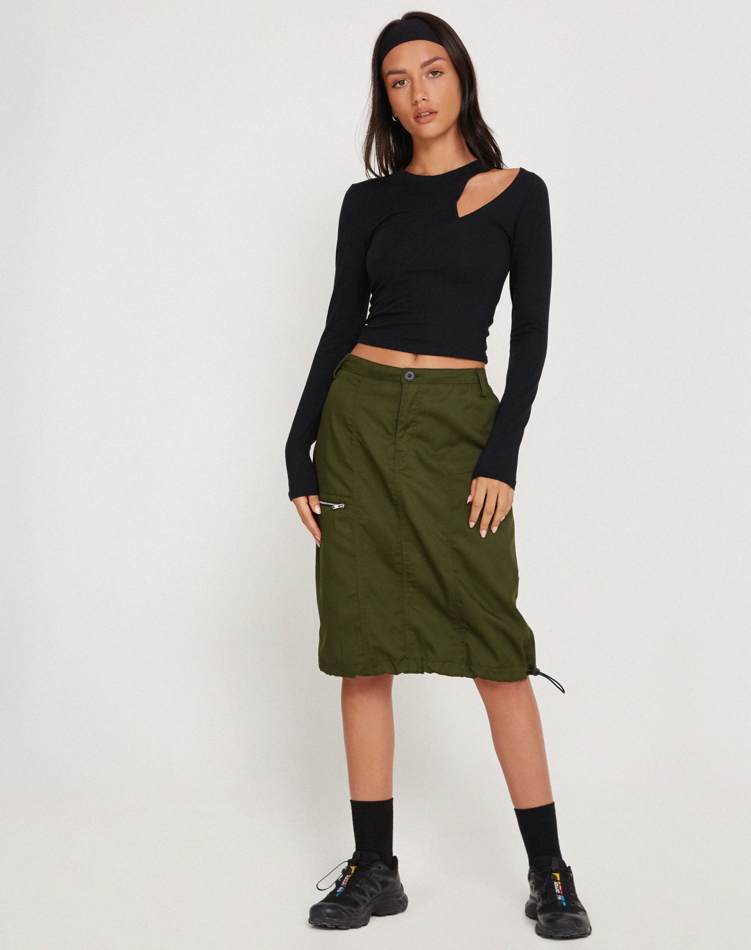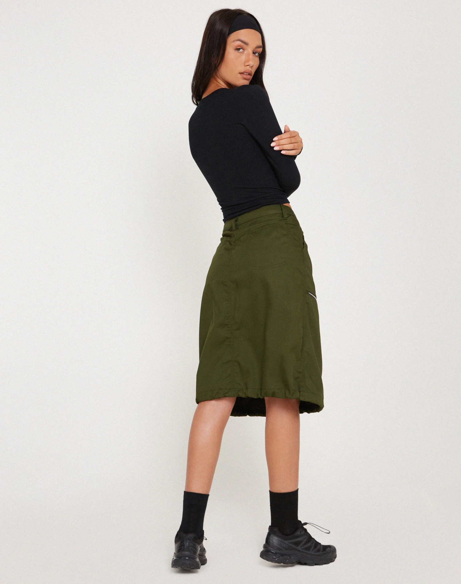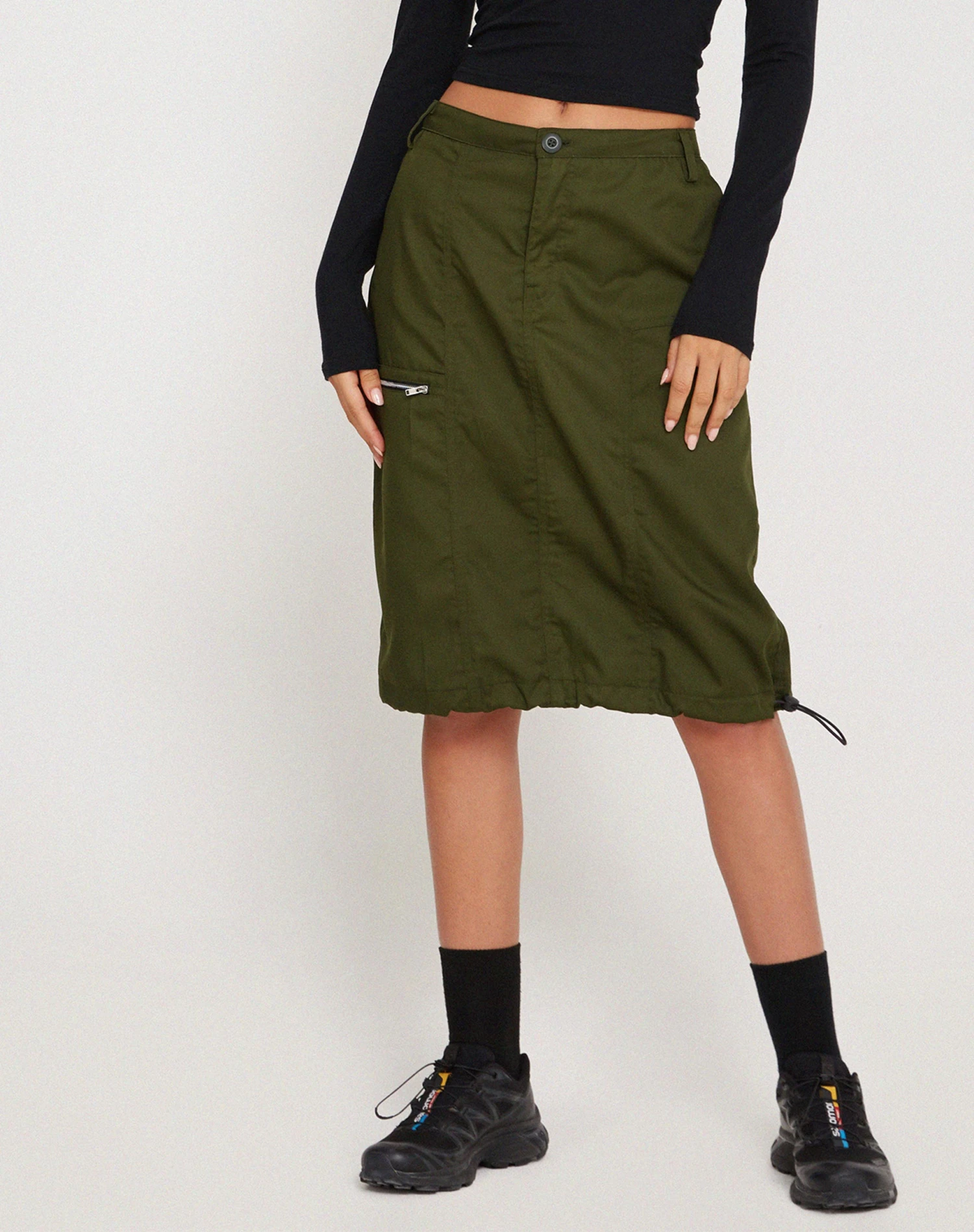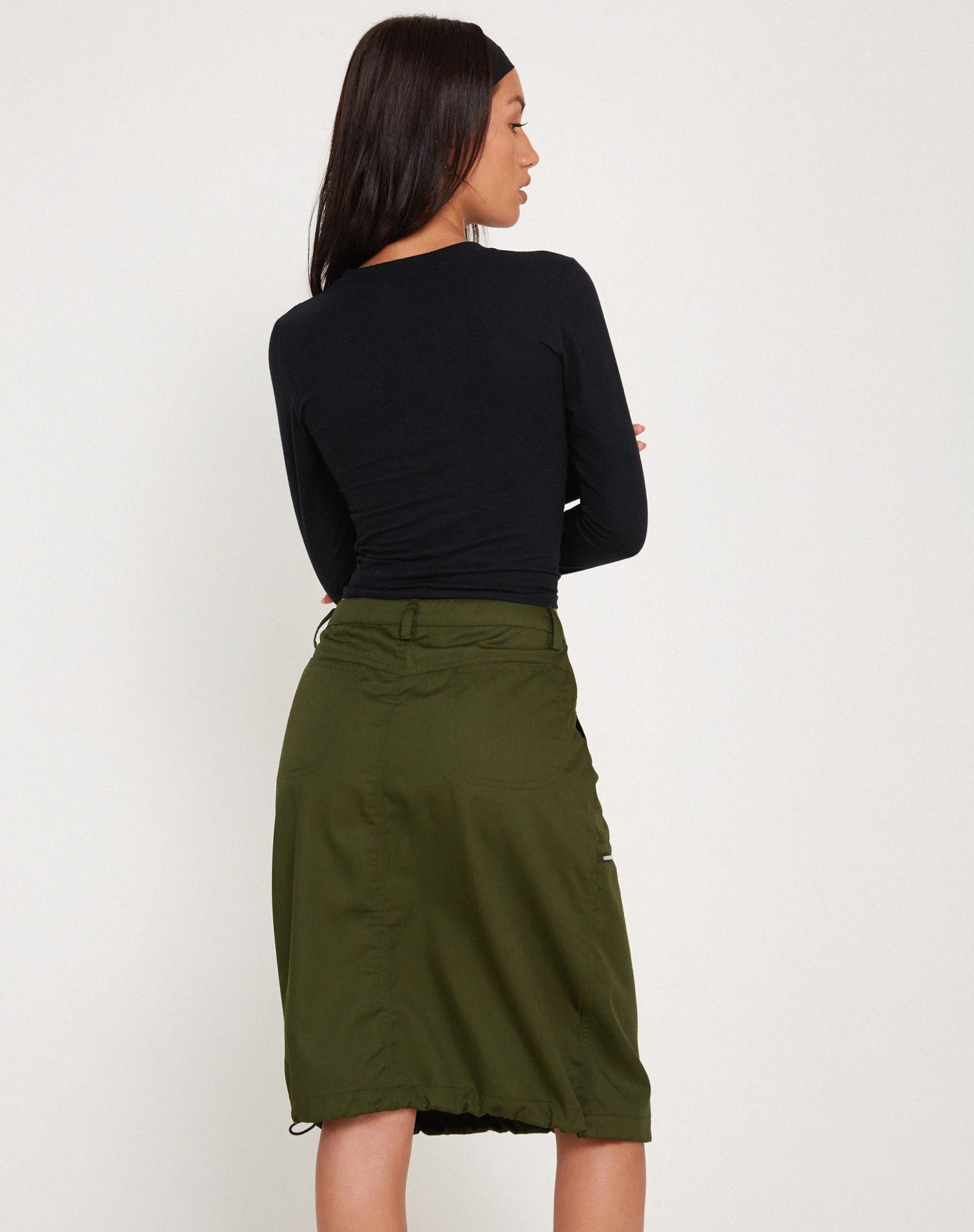 The Shreya Skirt features a loose, mid rise fit and a midi length hem with a drawstring toggle for an adjustable fit, in a forest green cotton drill fabric. Complete with a button fastening, belt loops and zip pocket detailing to right side. We love to style with our Mague top.