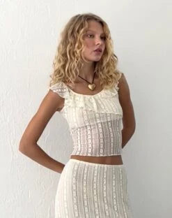 Turn heads this summer with our Simran Top. This stunning top features an off-shoulder bardot-style fit with a large ruffle across the neckline, with a frill on the right chest for added detail in a cream lace. Pair with our Betharia skirt.Â