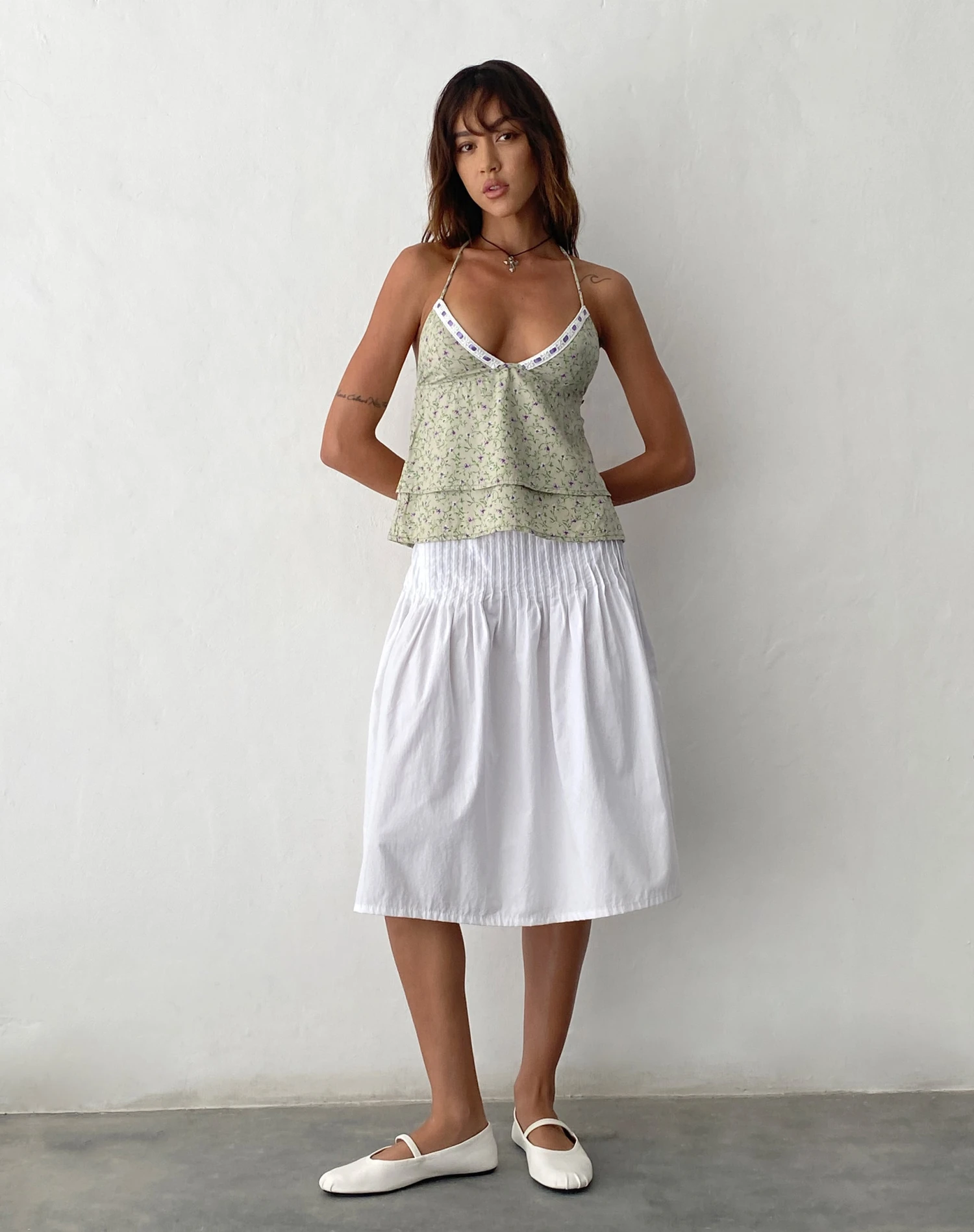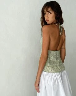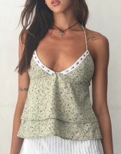 Give your top collection and upgrade with our Sisuki top. In a Parma violet print featuring a halterneck sleeveless fit, two tiered hem, plunge neckline and cream ribbon trim with purple bow detail.