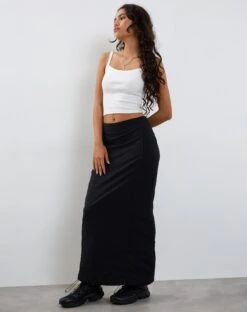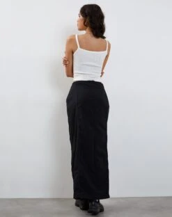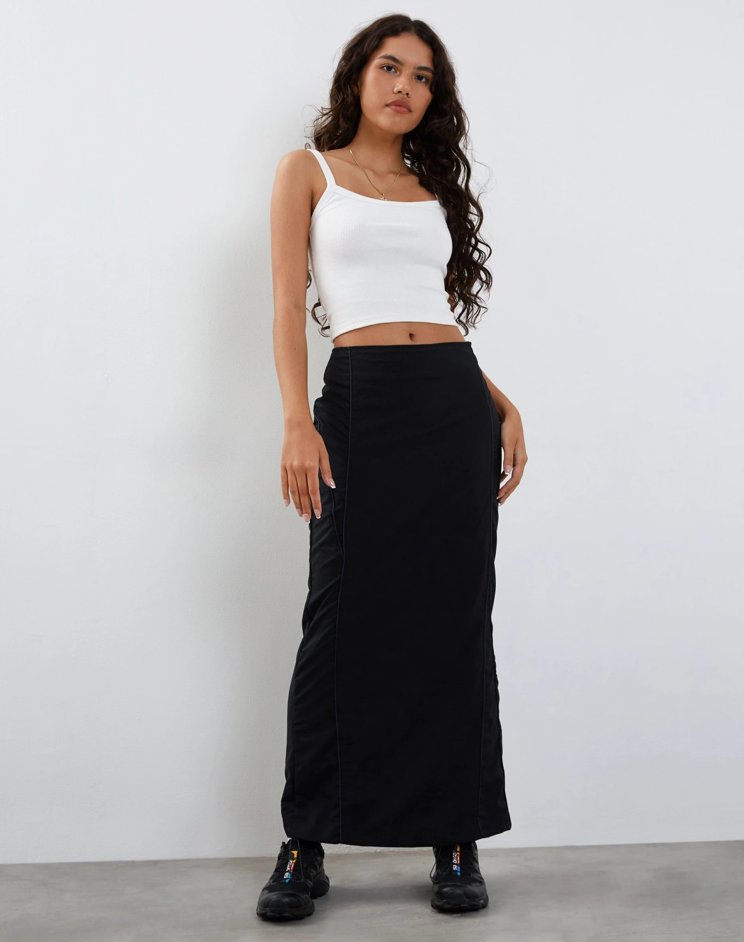 Our Skyla Maxi Skirt features a low waist and comes in a charcoal colour with dark blue piping. Style wit our Aus vest for a simple but cute ‘fit.Â
