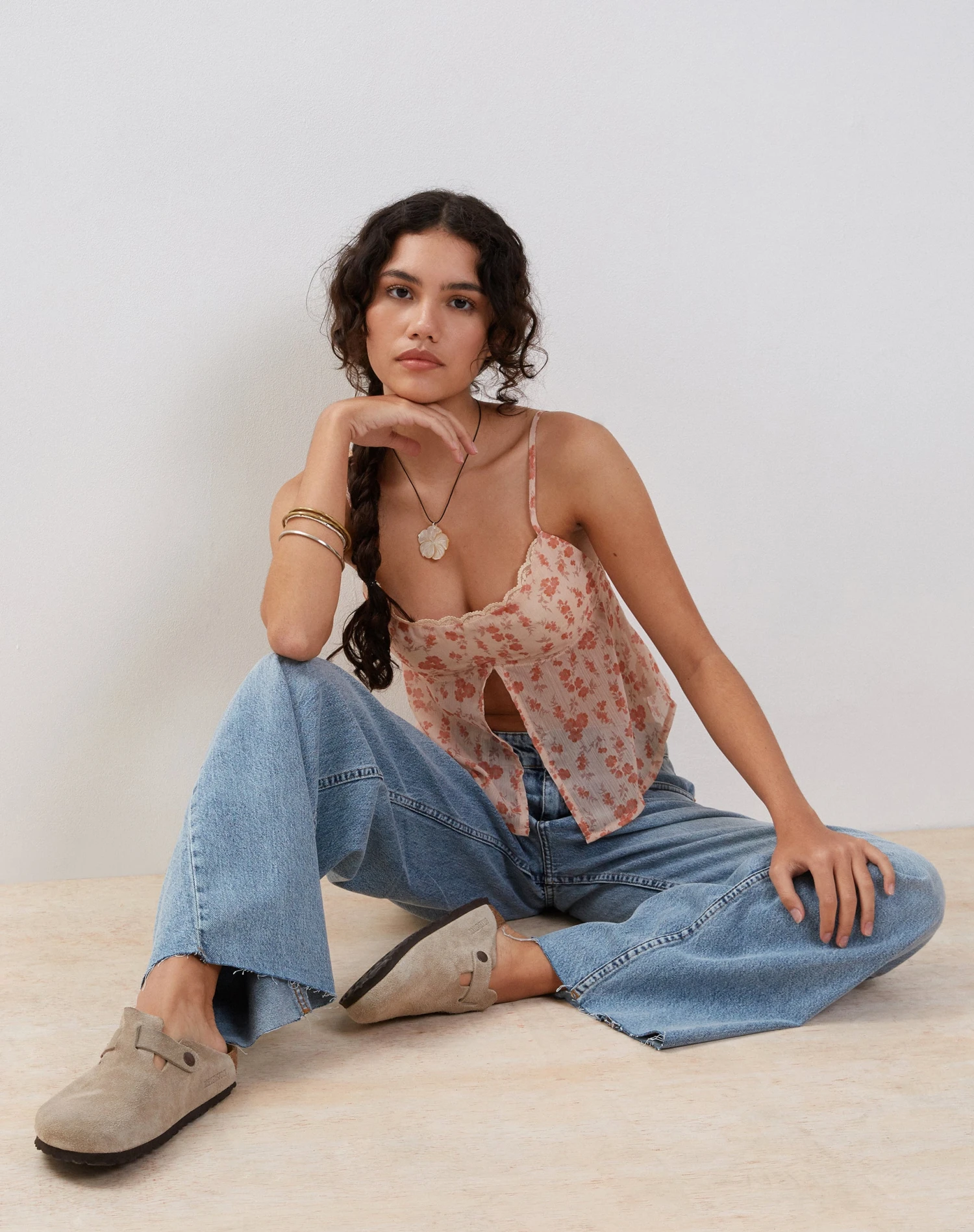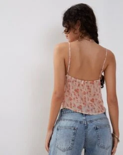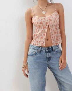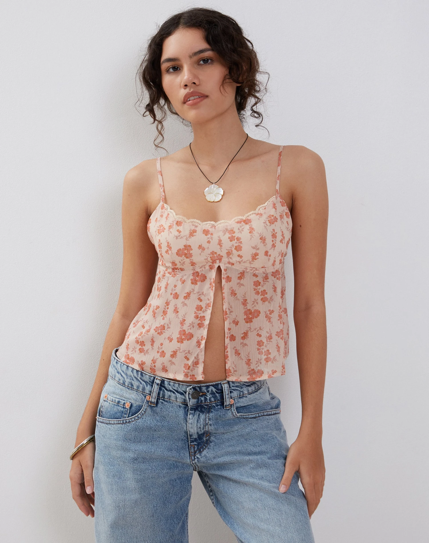 Slavina features a split front butterfly hem, with a delicate lace trim detailing and thin straps in a lightweight printed chiffon. Style with some wide leg denim for a relaxed ‘fit.
