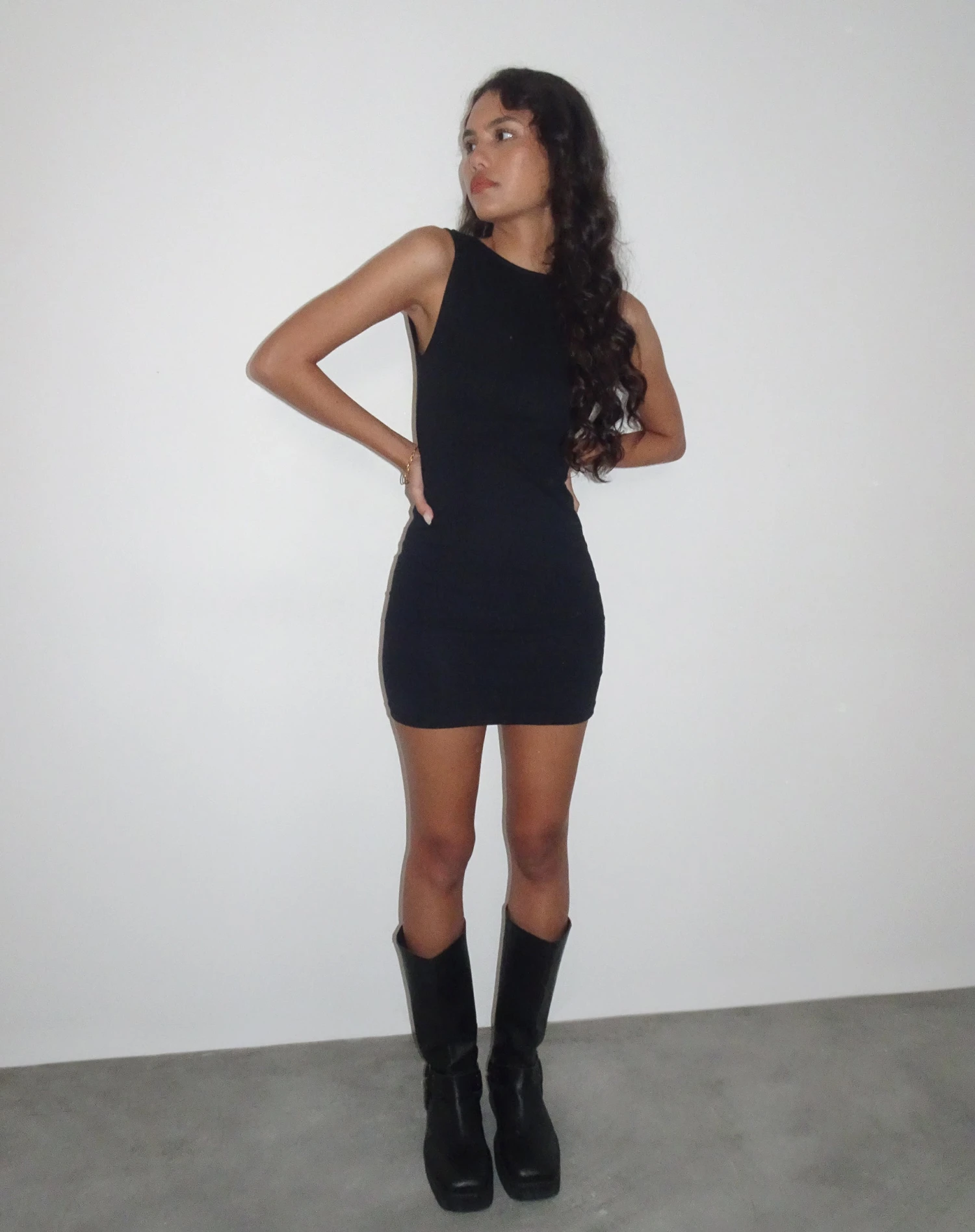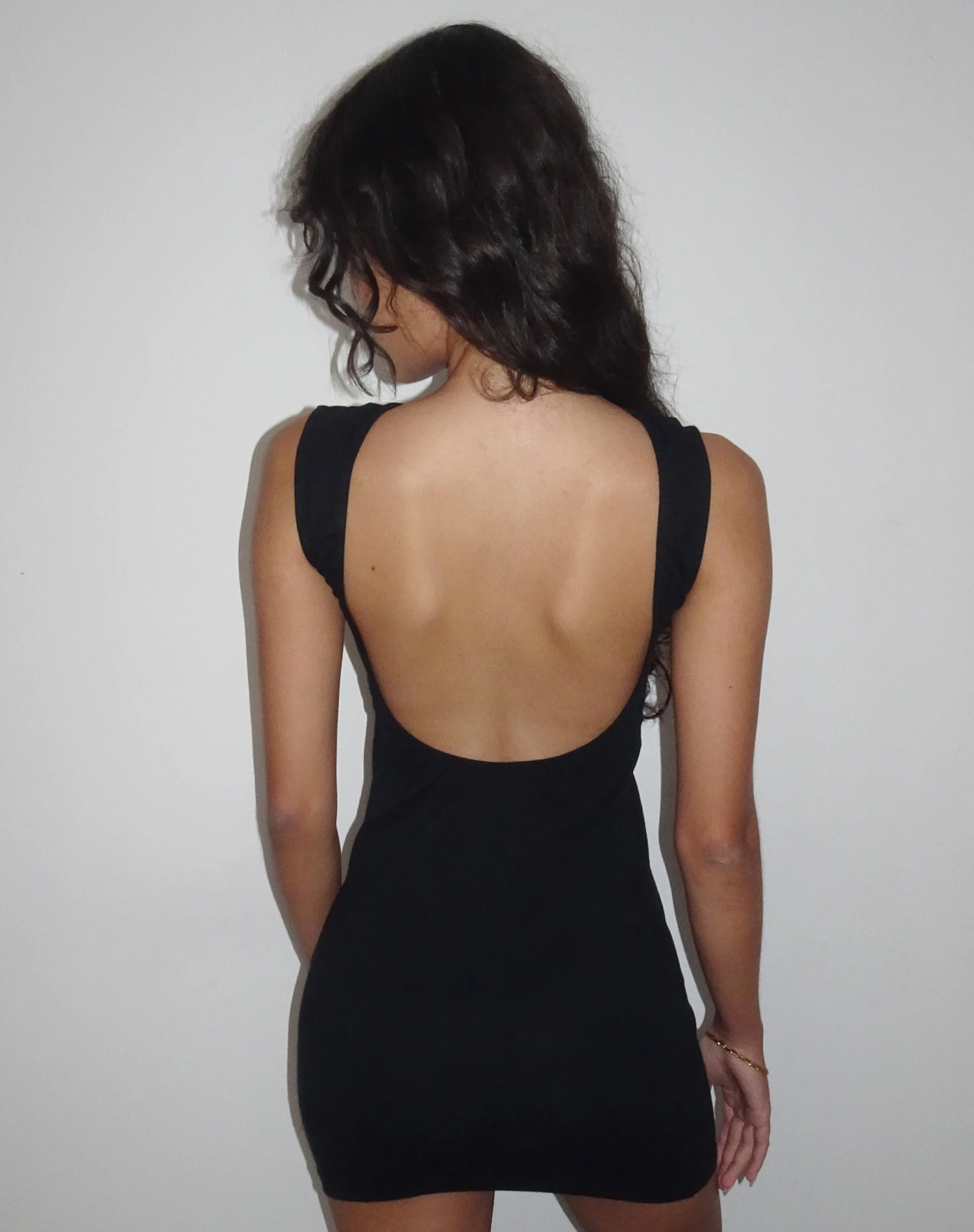 Add some elevation to your basics this season with our Slony dress. Featuring a Low back mini fit with sleeveless design with crew neckline in black lycra.