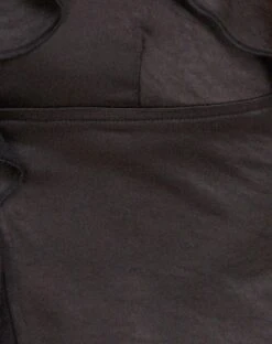 Black crop top in satin with halterneck straps. Featuring a V neckline and tie up bust detailing. Finished with a frill hem.