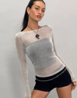 Stay on trend with our Suzette Top. Featuring long sleeves and comes in a silver chain material. We love to style with our Rerita shorts.Â