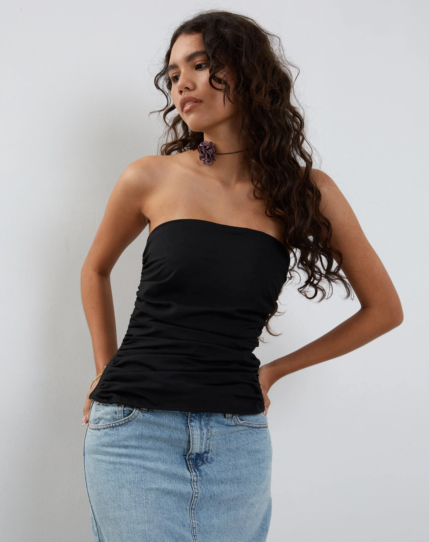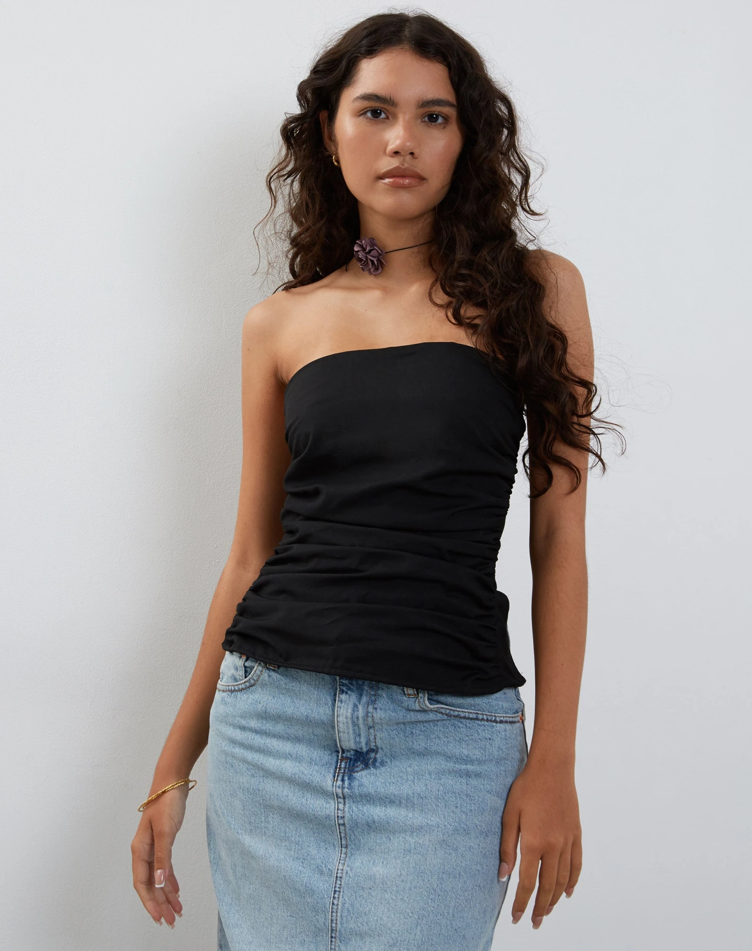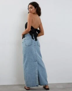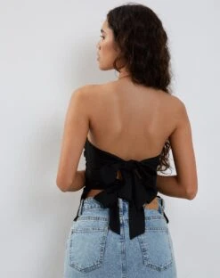 Not your usual tube top. The Tahari in black has a bandeau neckline and features adjustable bow ties at the back. We love to wear with our Denim Maxi Skirt.Â