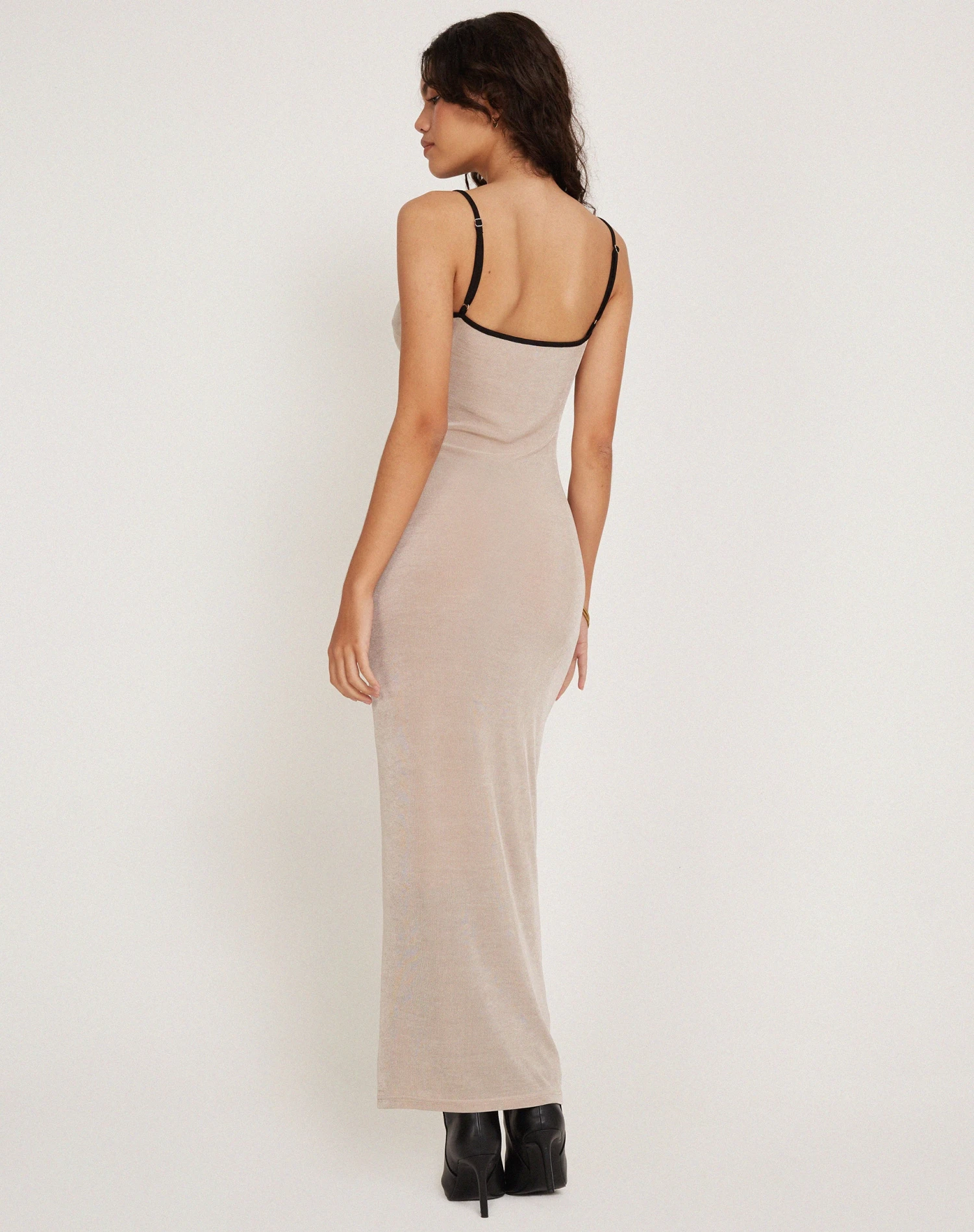 The Tahlia is a slinky crepe maxi dress in champagne, featuring key hole detail on bust and black thin straps with black binding.