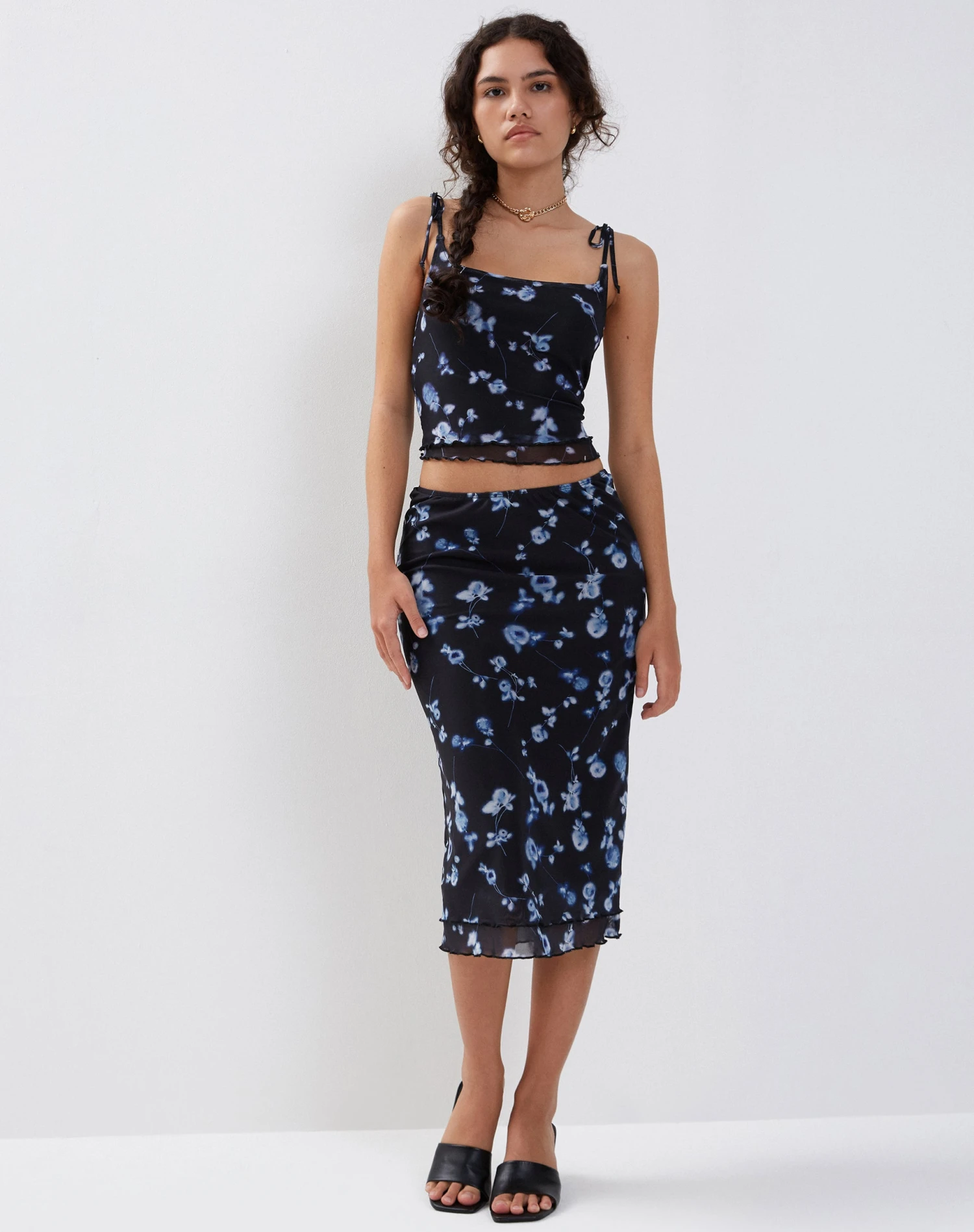 Our Tamari vest top features a square neck with thick tie detail straps and mesh layering in a diffused floral navy print. Pair with our matching Eldonia midi.