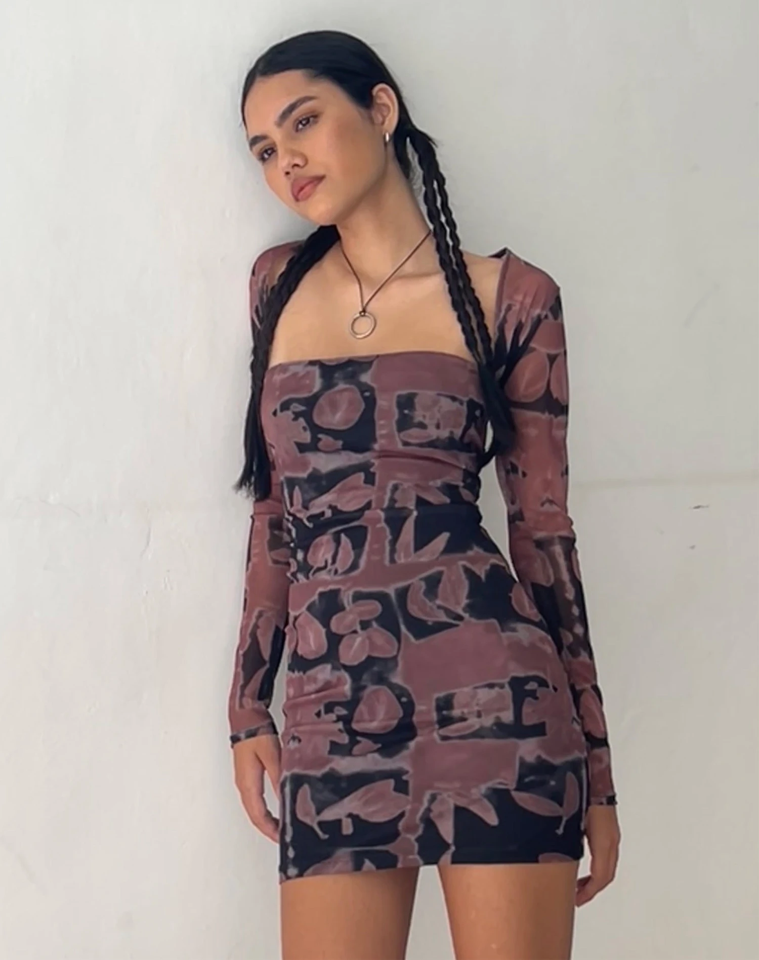 Long sleeve mesh mini dress with square neckline in a printed botanical bleed black.