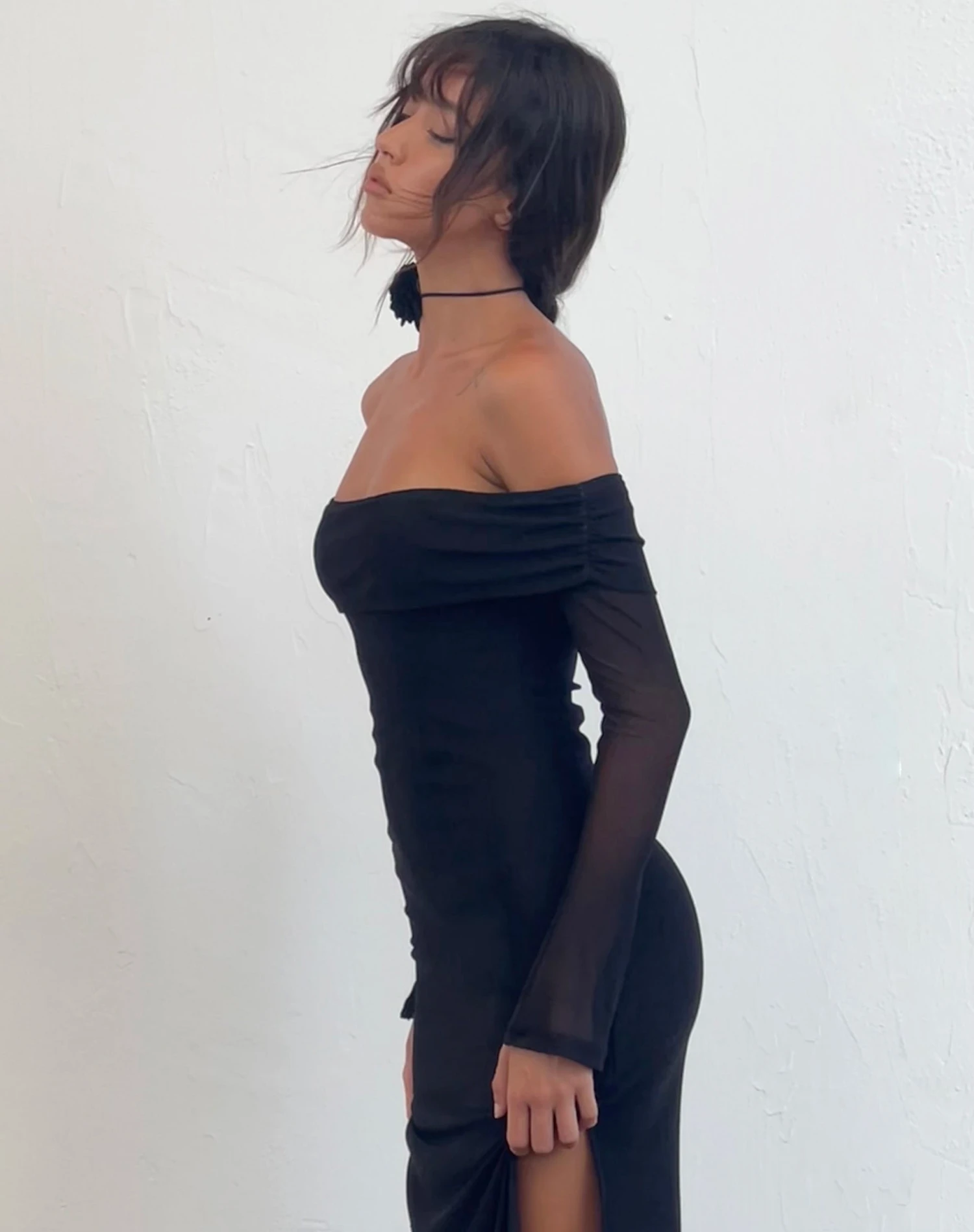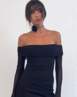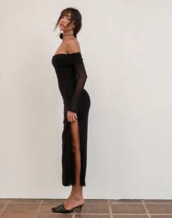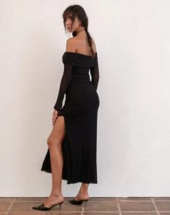 The perfect evening dress. The Terika Dress has a bardot neckline, long sleeves and a maxi length in a mesh black material.