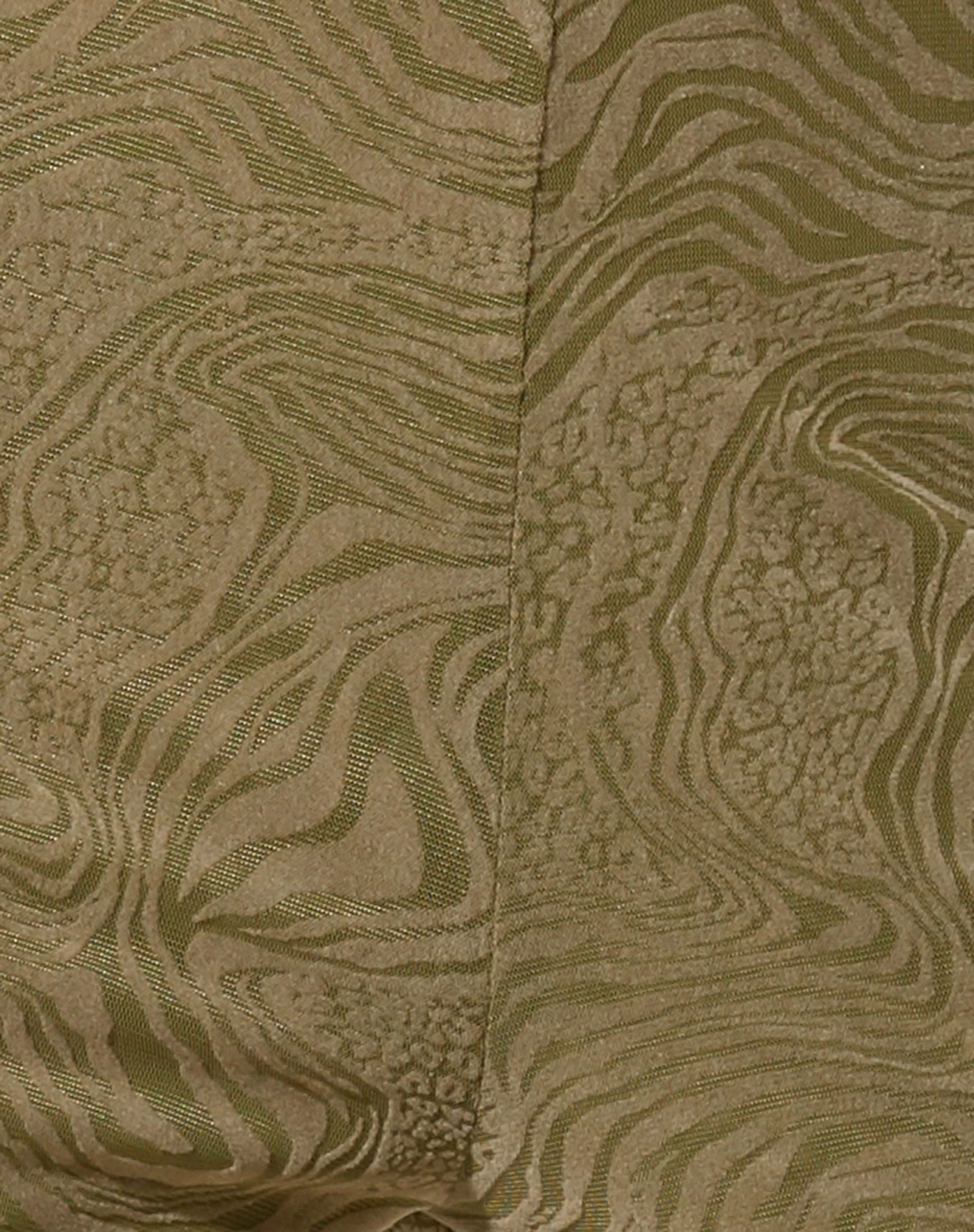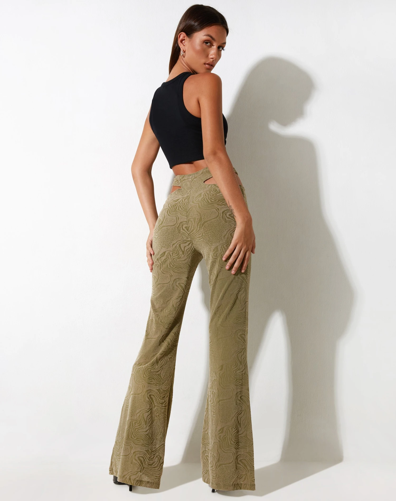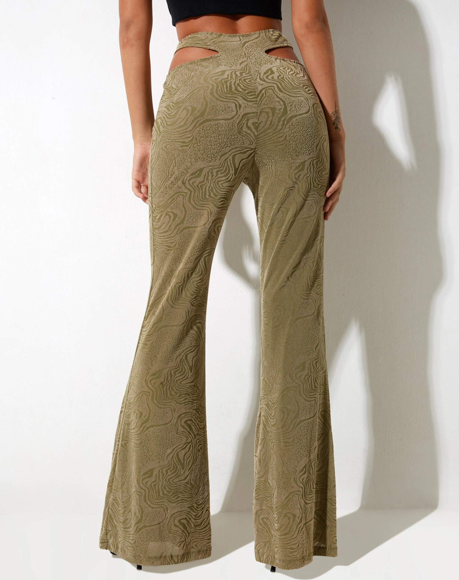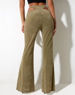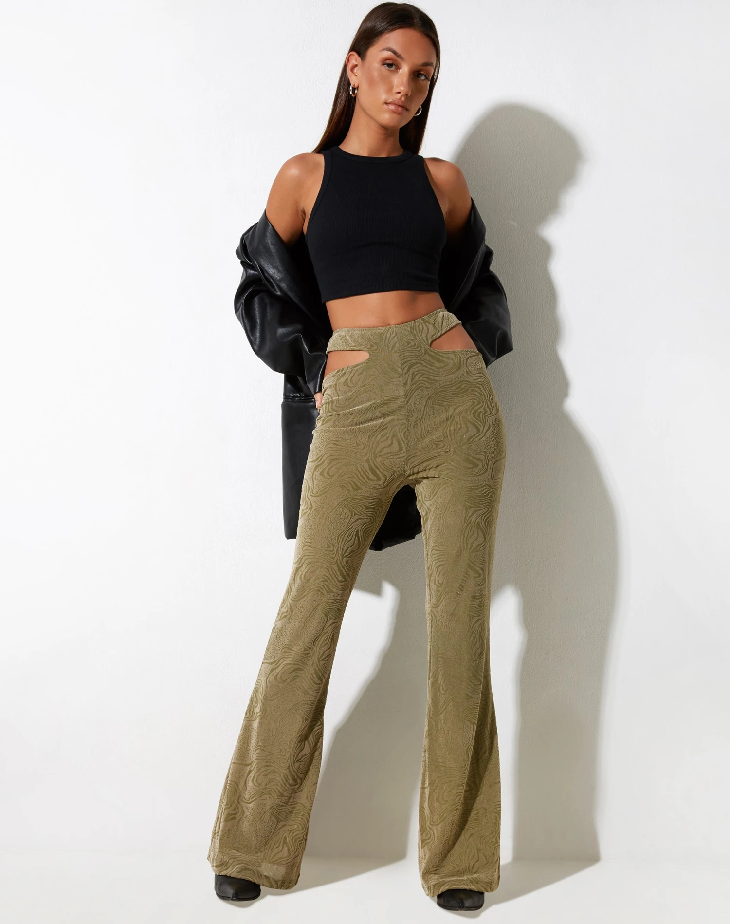 For a subtle statement, the Tuleen trousers have got you. In a mixed animal flock olive they feature a high waist with cutout detail and flare leg.