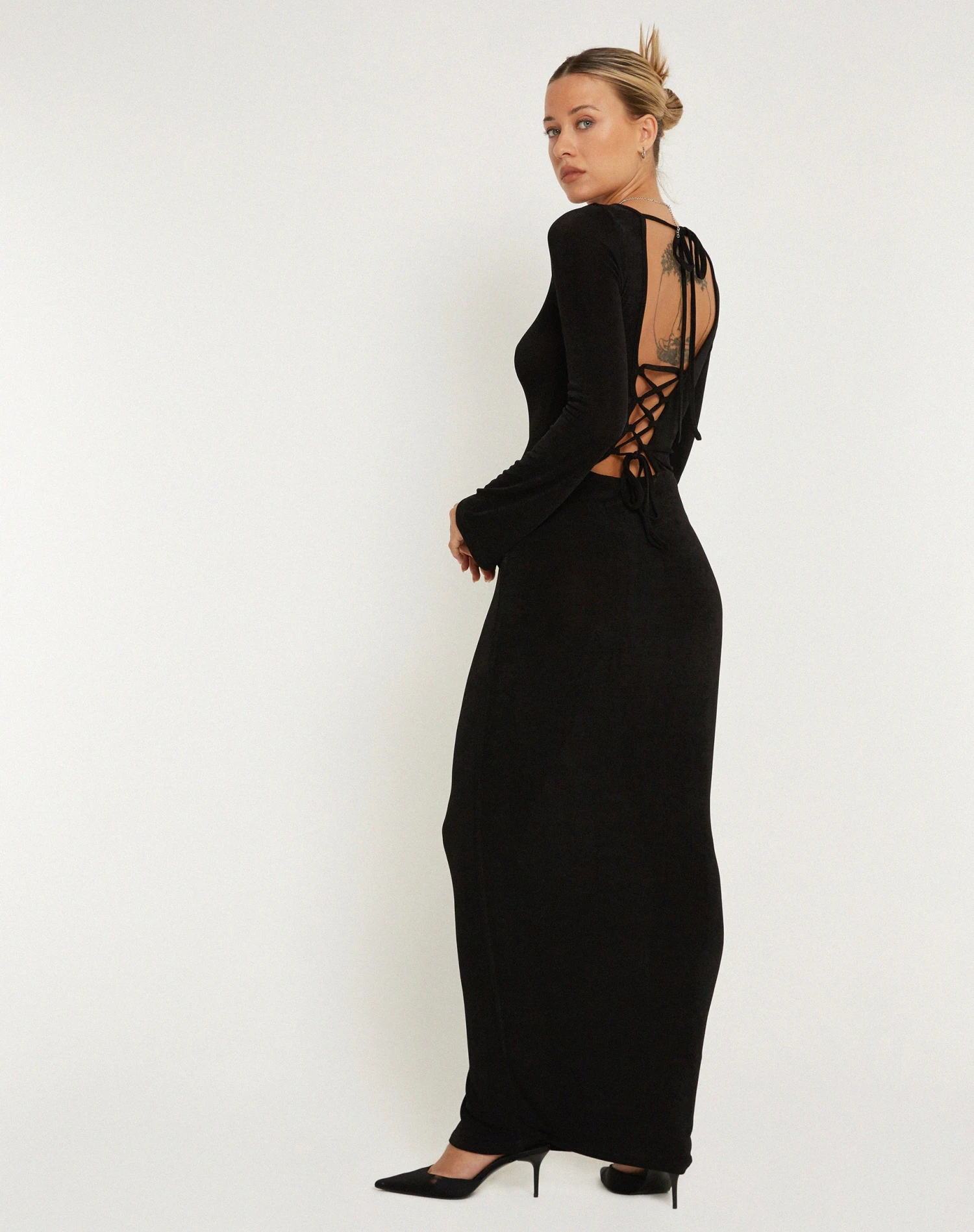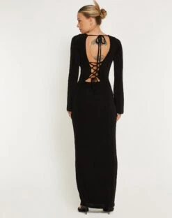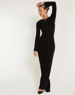 Maxi length dress with long sleeves and a high crew neckline in a black jersey fabric.