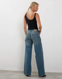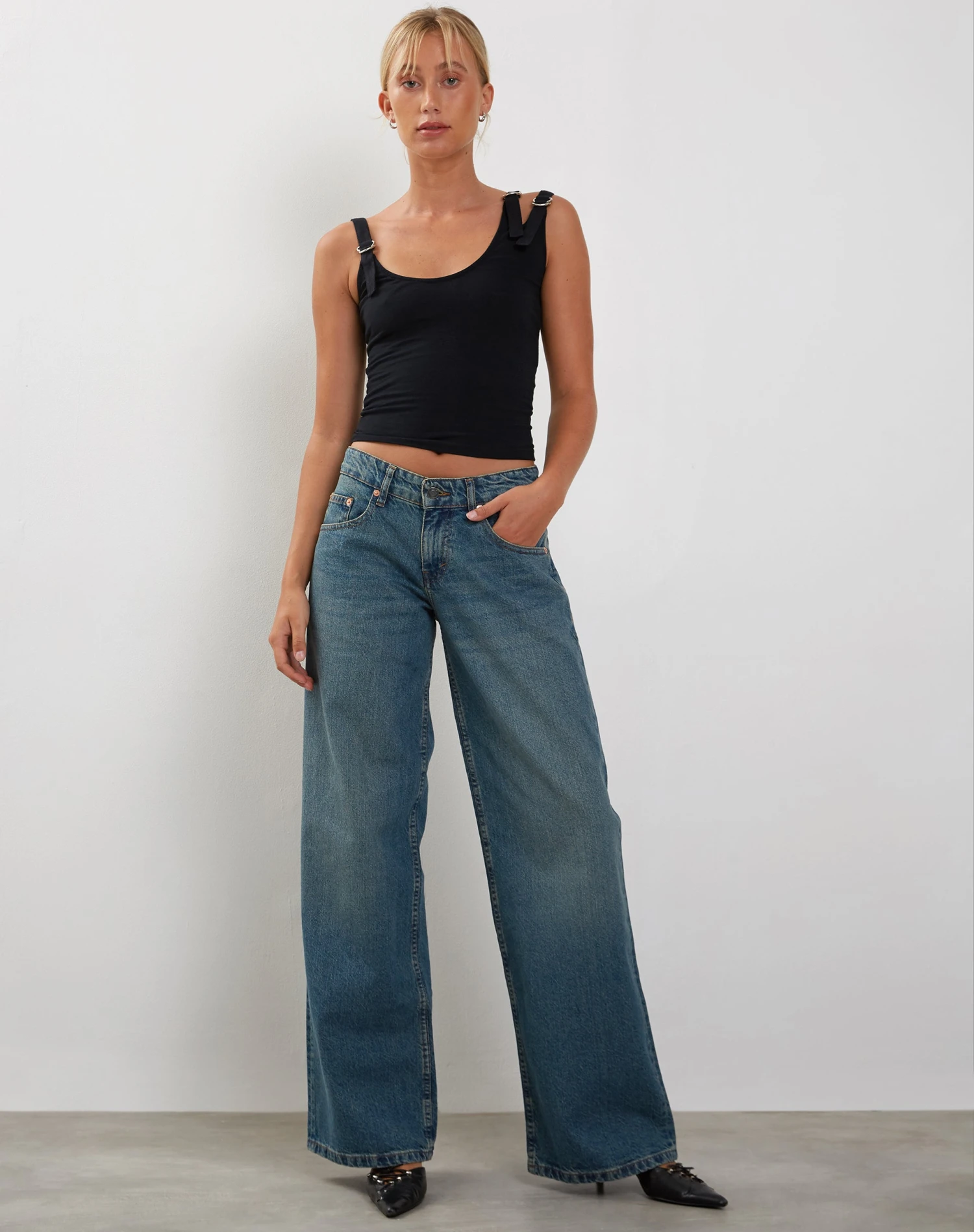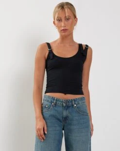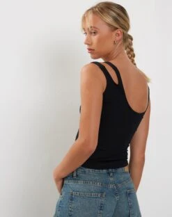 Level up your basics with our Verity top, this black ribbed vest features an asymmetrical double strap on the left side as worn and D ring adjusters with a scoop neck. Style with our parallel jeans in light wash denim.
