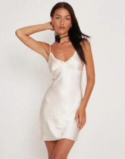 In an ivory heavy satin fabric, our Vilarica dress features a mini length hem, cami straps, and a V neckline with lace detailing and a decorative bow.