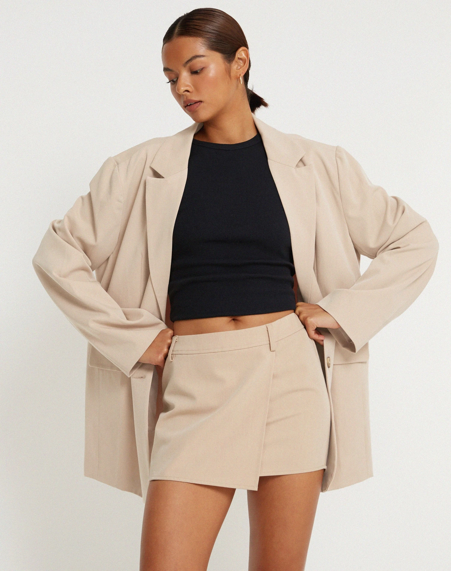 Say hello to neutrals with our Wahip skirt. Featuring a mini fit with belt loops in a soft beige. Simply style with the leah crop and add chunky trainers.