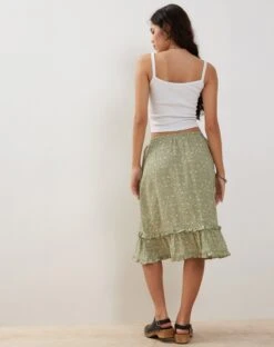 The Wala skirt comes in a midi length, featuring a ruffle hem and a floral green print.