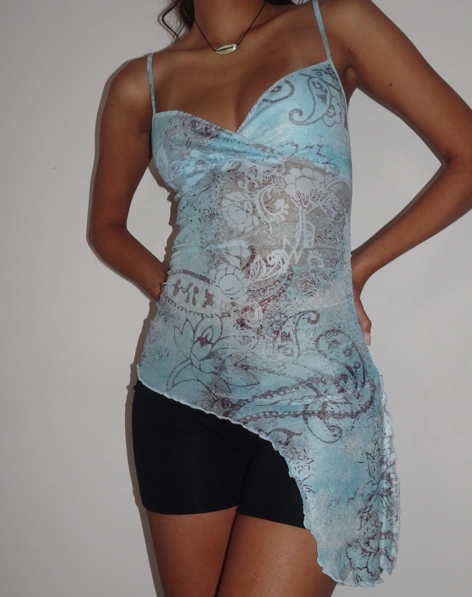 The Warica Top is perfect for your next night out. Featuring thin straps, a v neckline and an asymmetric waterfall hem, in a blue paisley abstract rustic print. Paired with our Biker short in black.