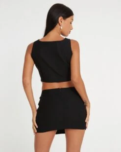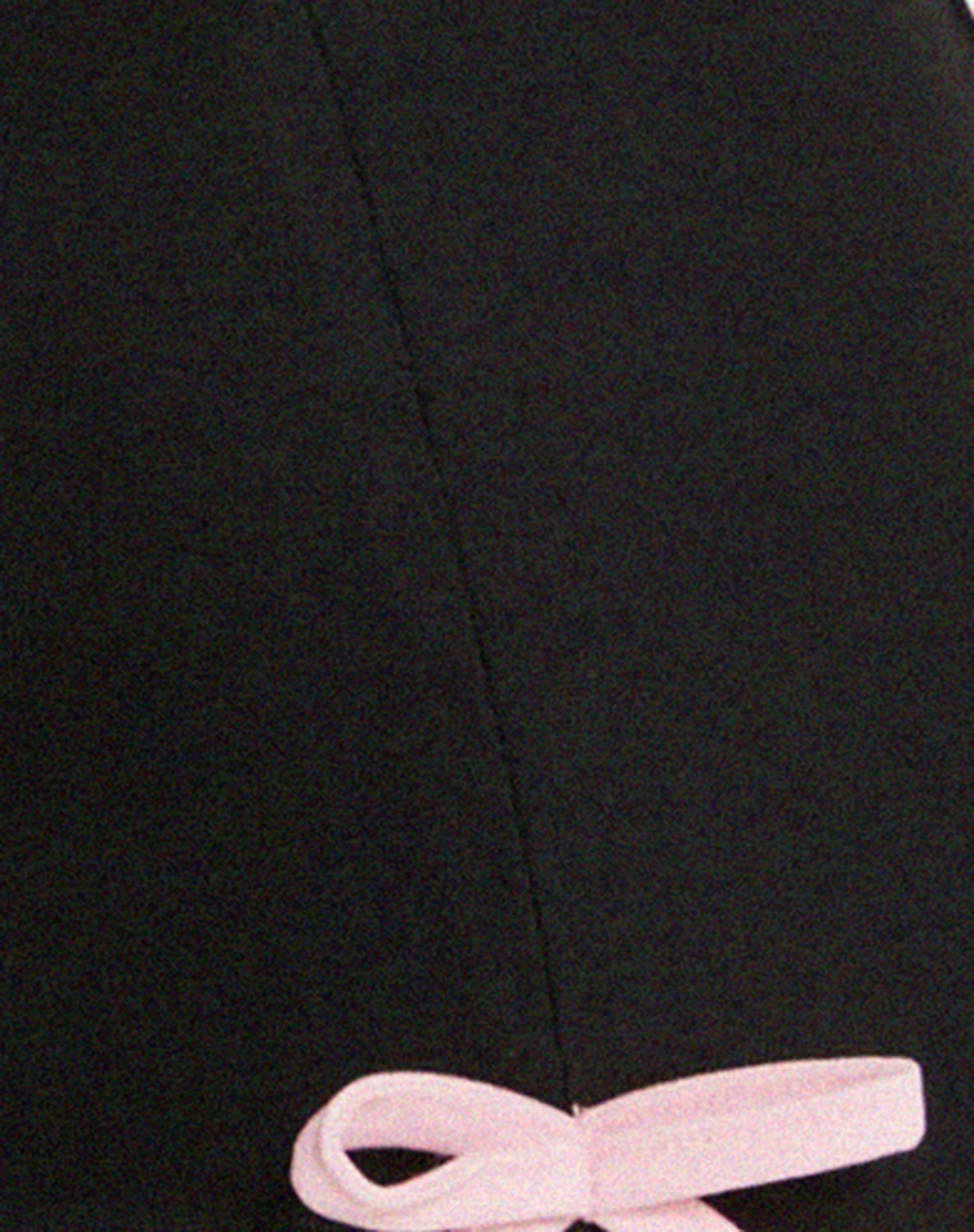 The Wei skirt is perfect for weekend styling. In black, it features a mini, bodycon fit with a side slit and pink bow detailing. Match it up with our Kenaya crop.Â