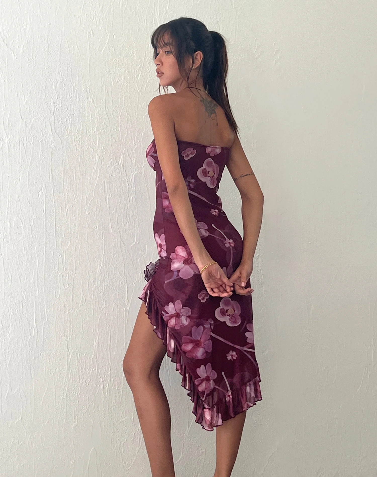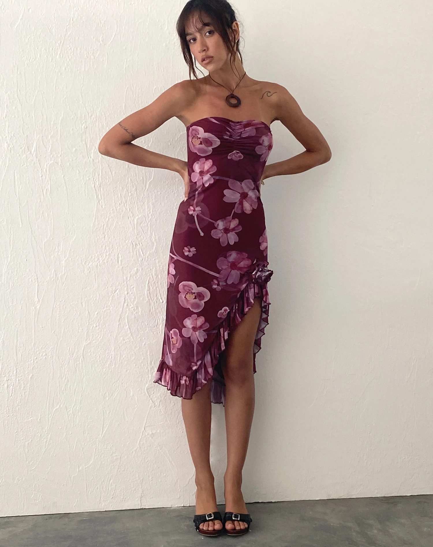 Our Weti dress, in watercolour floral berry, features a bandeau neckline and bodycon mini length fit with a cascading waterfall hem framed by ruffle detailing.