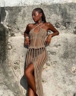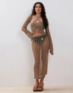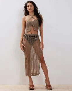 The Willa is a sheer knitted midi skirt, featuring a daring side split and comes in a desert taupe colour. Match with our Phoebe Top and Mika Shrug for a matching co-ord.