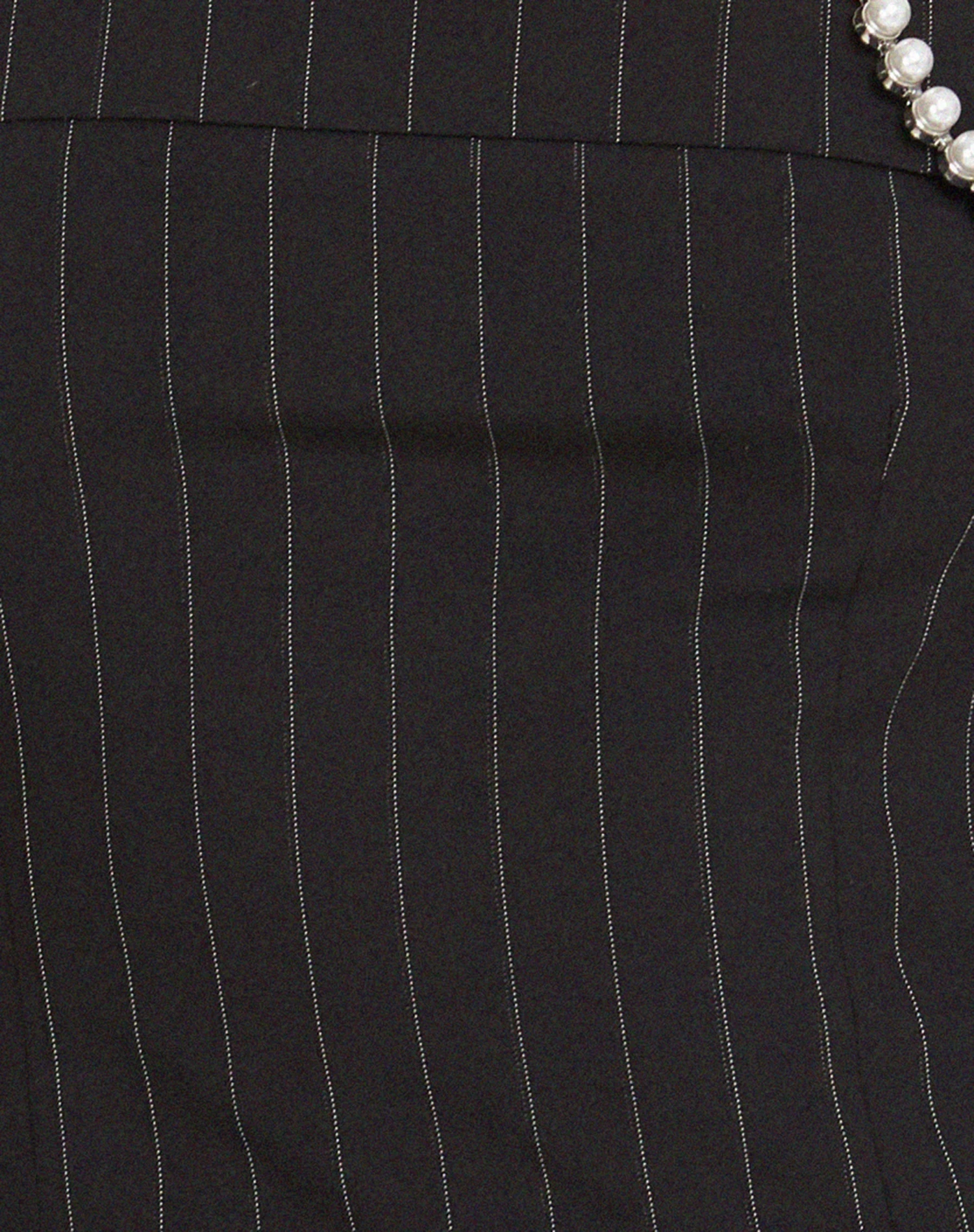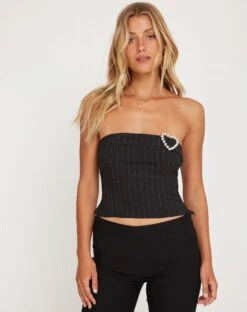 Bandeau sleeveless top in black pinstripe, featuring a heart shaped pearl buckle to the upper side bust . Match it up with our Ayumi skirt.