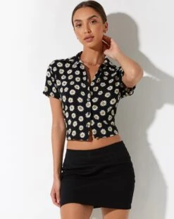 Add some floral print to your wardrobe with our Yuwen shirt. In grunge daisy black, it features a collared neckline, short sleeves, button up front and a cropped design. Finish the look with our Ima Skirt in black and black chunky boots.