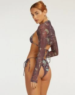 Long sleeve shrug style top in a printed stretch mesh fabric. Match it up with the Pami bikini top and Leyna bikini bottoms in botanical animal brown.