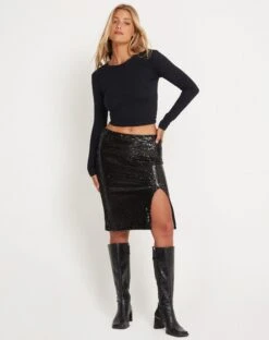 This black sequin midi skirt is a statement piece, featuring thigh high split. Every night outs must have item. Pair with our Bon Top for classic cool girl ‘fit.